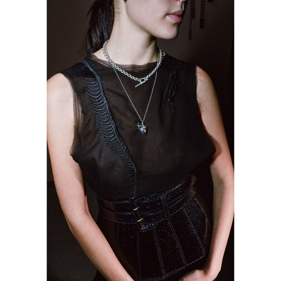 Long sleeved Fitted Silk tulle top with embroidered Snake Spine tattoo Artwork.
